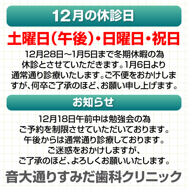 12月休診日情報|音大通りすみだ歯科クリニック|庄内駅近くの歯医者